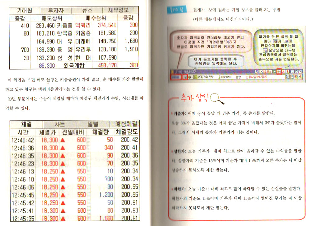 왼쪽 추가상식도 필요이상으로 설명을 장황하게 늘어놓는 느낌이고, 오른쪽 페이지는 필요없는 부분까지 캡쳐된 주문창 이미지를 그대로 사용한데다가, 뒷장에 있는 각 번호 설명을 오가면서 봐야하는게 불편하다.